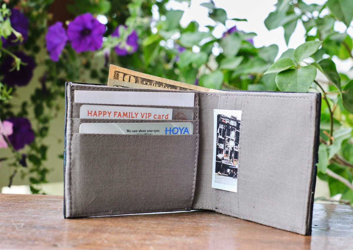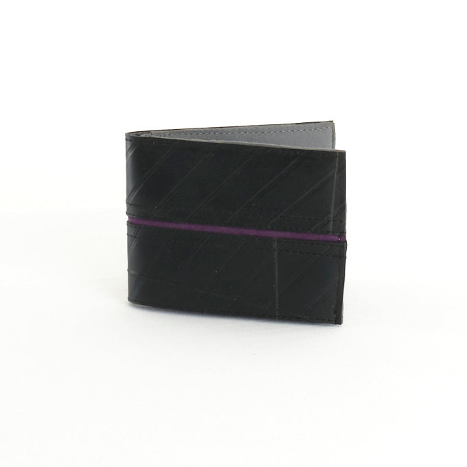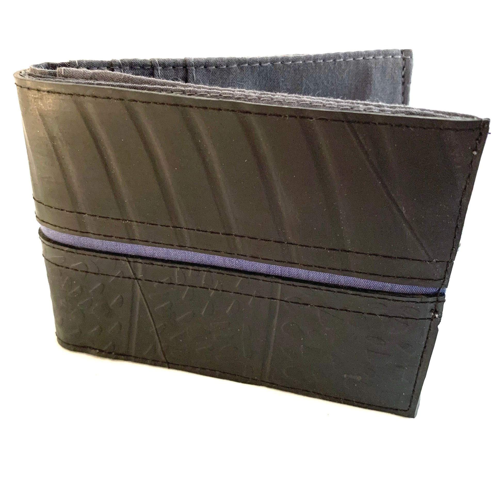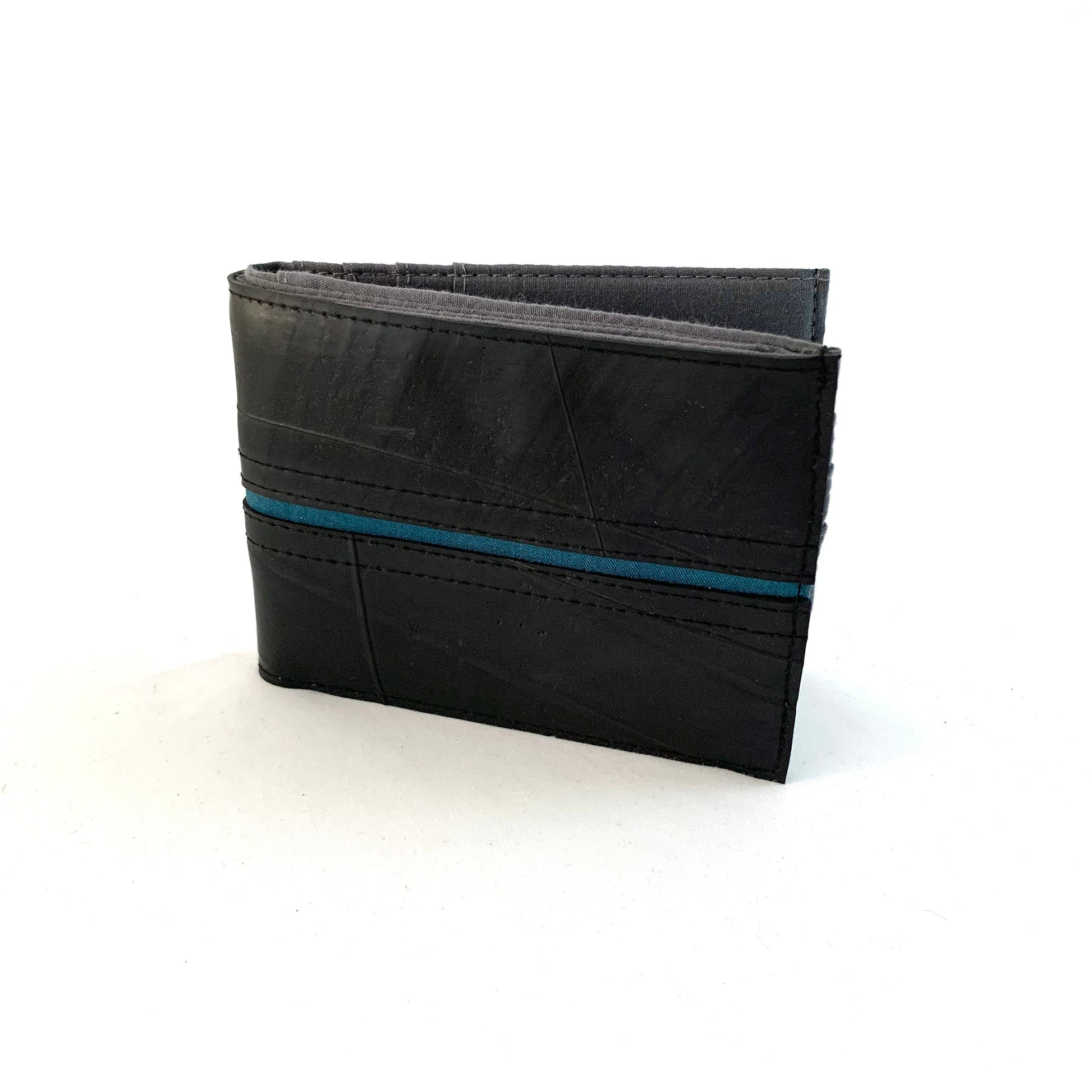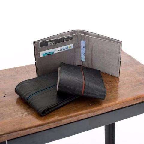 Our environmentally-friendly bifold wallet is made from reclaimed tire inner tubes and features a pop of color on the exterior. Several slots for ID/cards and two compartments for bills.