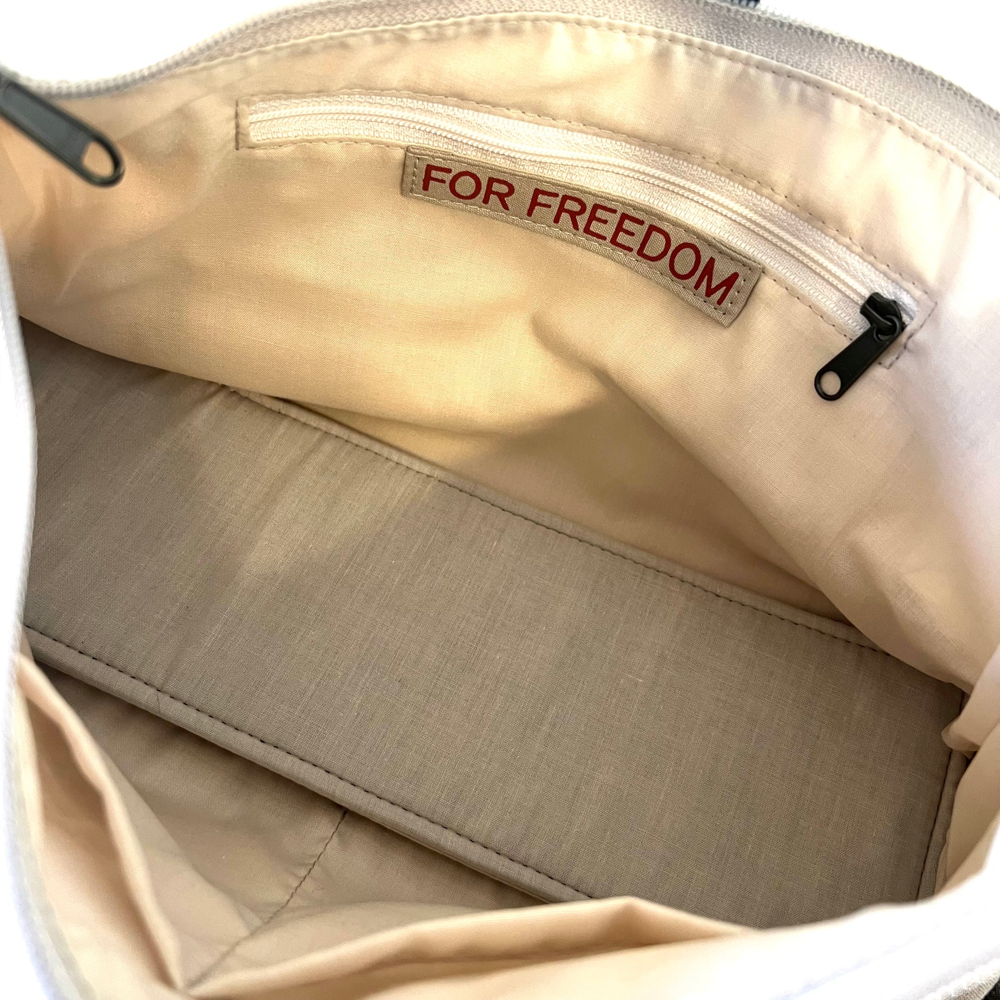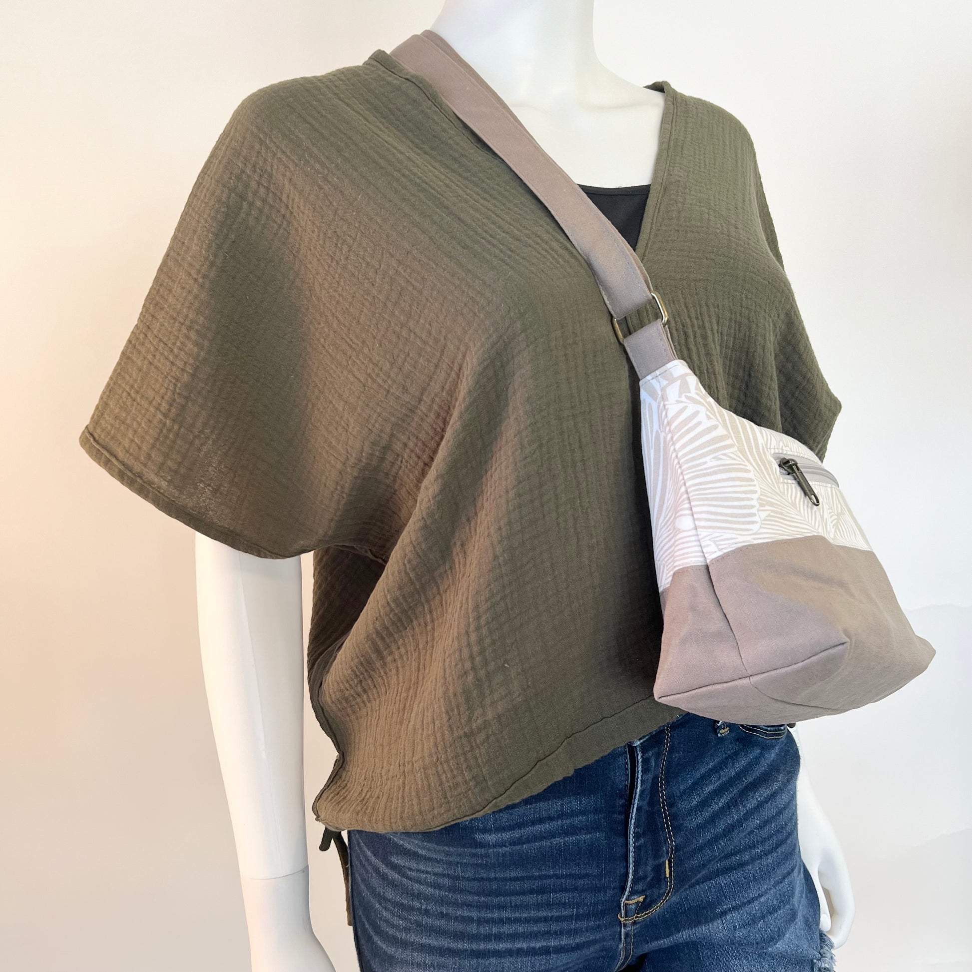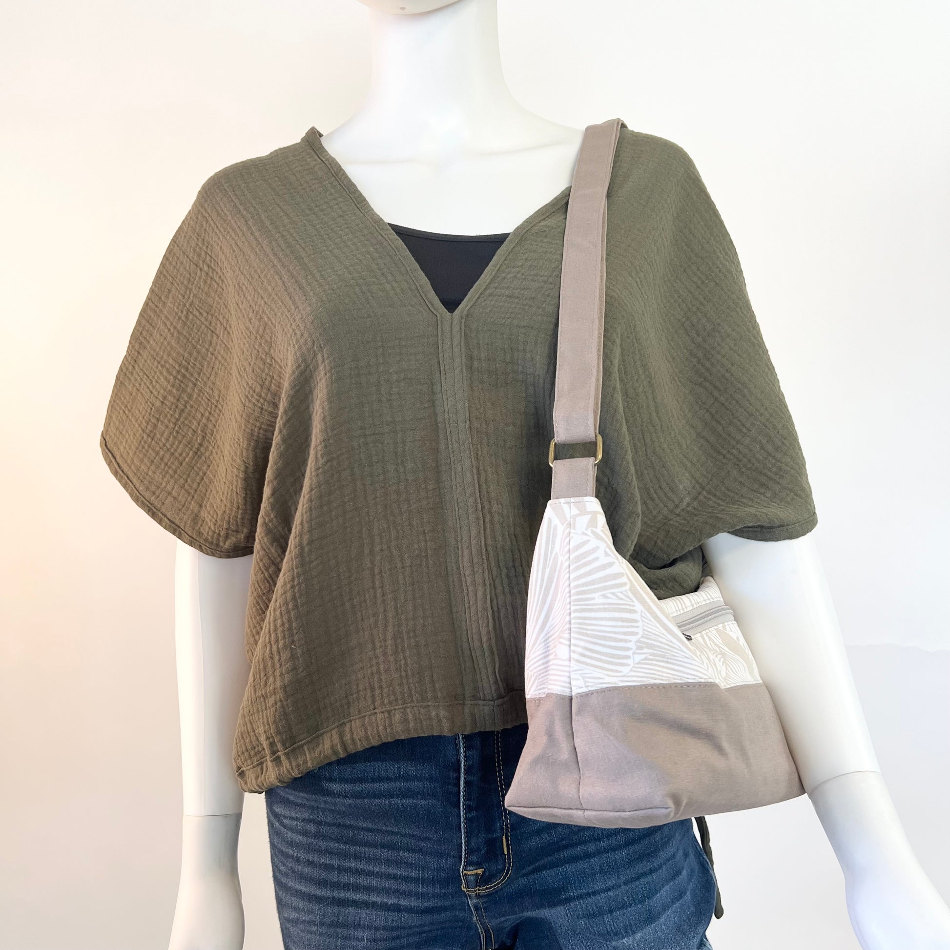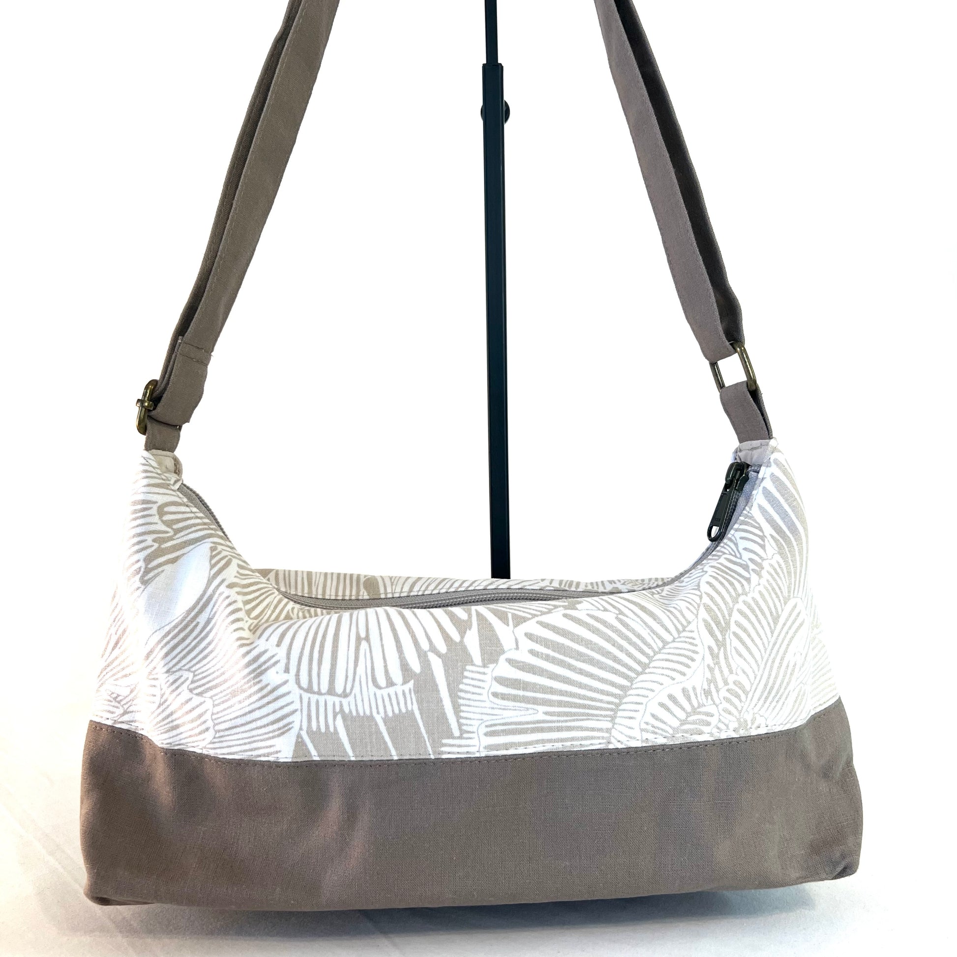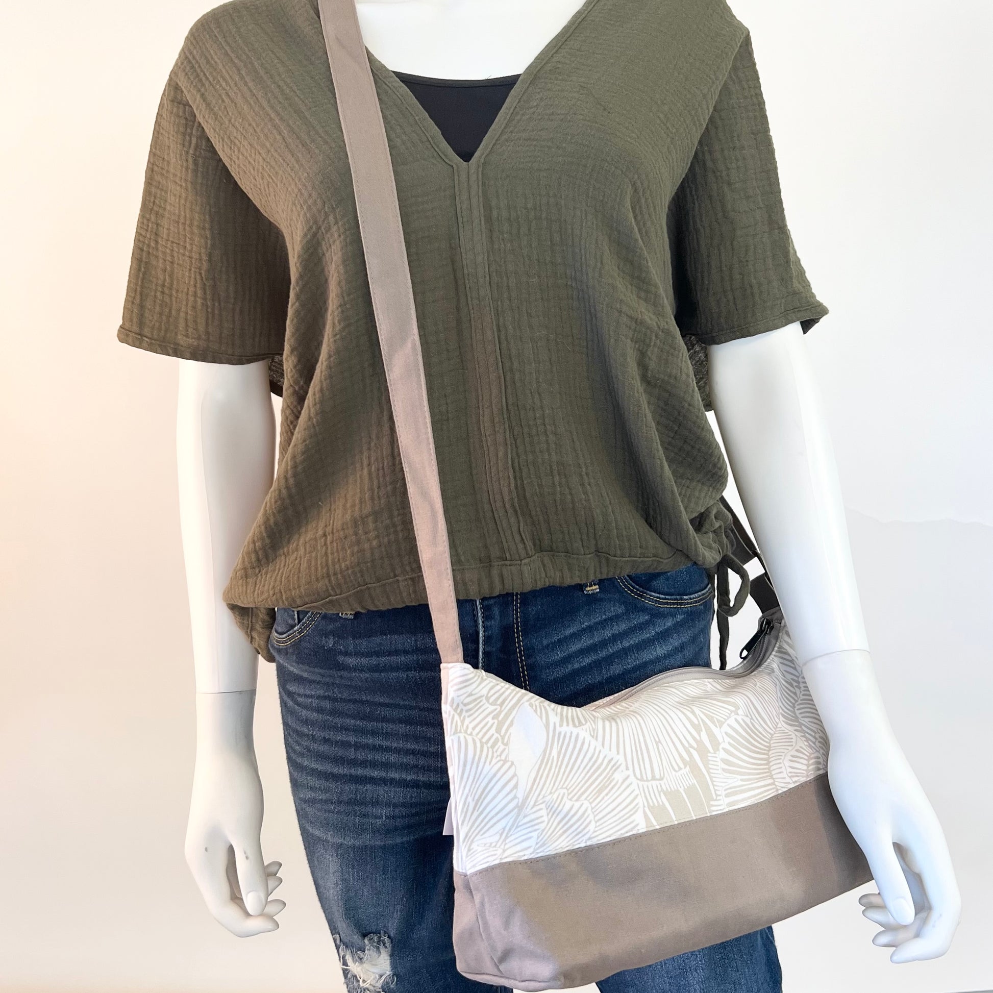 This adorable bag has a two fabric styling with a curved silhouette. It has a removable foam bottom adding structure with a zip top closure and an adjustable cross-body handle. Outside is a zippered pocket and inside is fully lined with an additional zippered pocket and 2 open pockets.