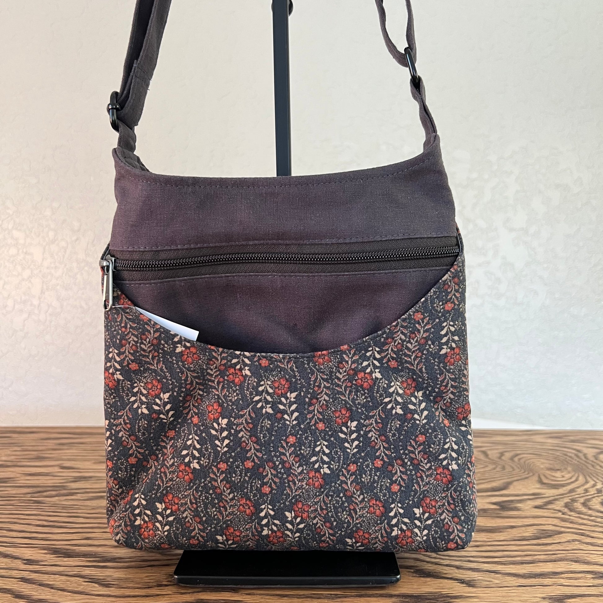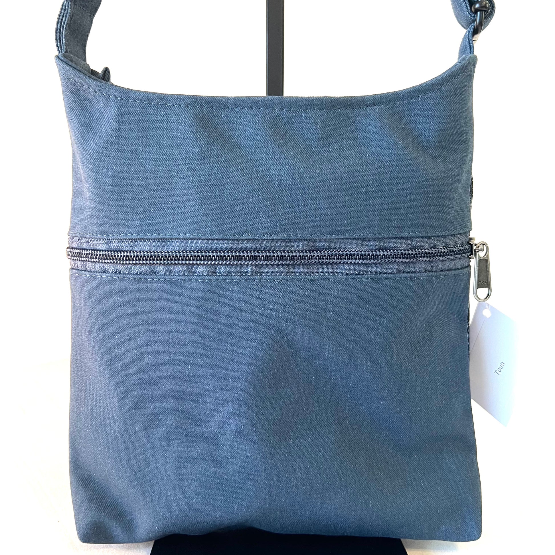 Our Toun bag has gone through a redesign. It has a wider base and a curved top to allow for easier access to your items along with an addition of a back zippered pocket. Toun is a medium sized, zip-top cross body/shoulder bag that has a signature curved front pocket along with front and back zippered pockets. Inside you'll find our standard interior with 2 open pockets and 1 zippered pocket.