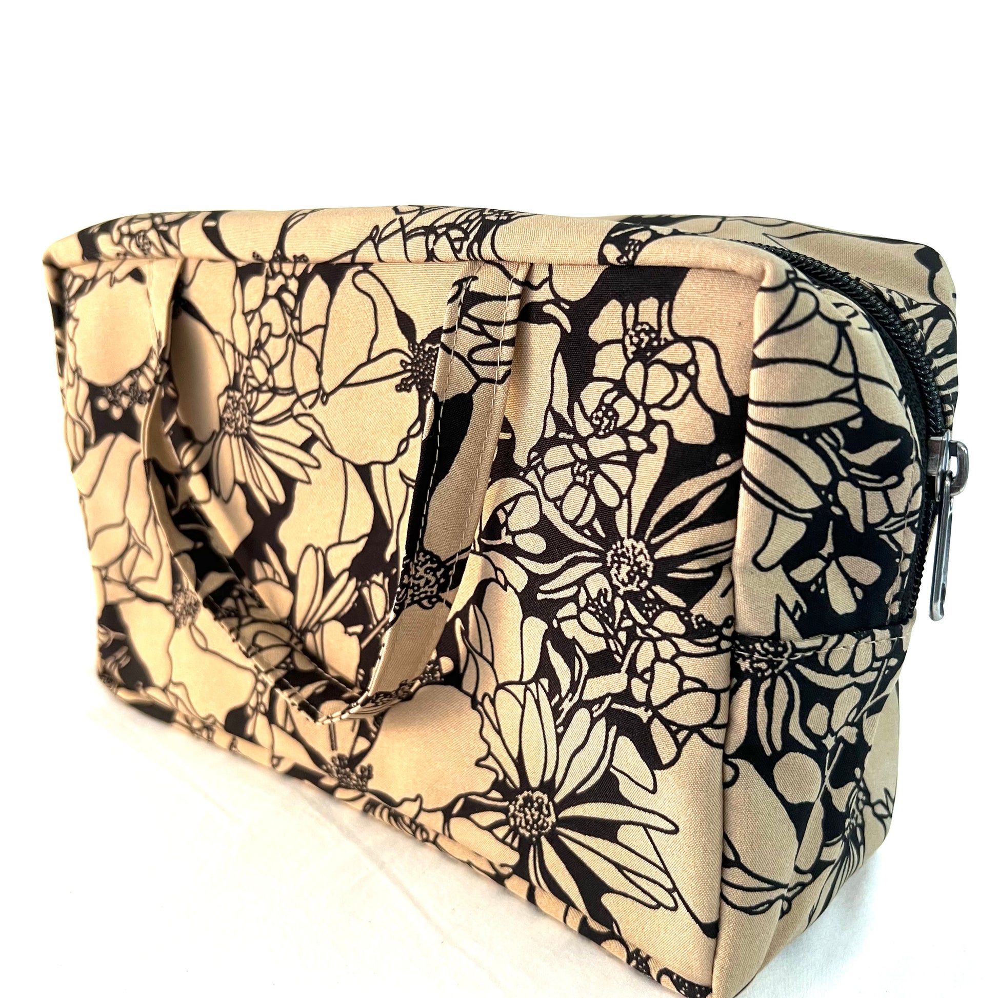 Our Travel Cosmetic is a beautifully crafted bag. It is lined with plastic and has 2 inside pockets. It also has 2 soft handles to easily grab it and go!