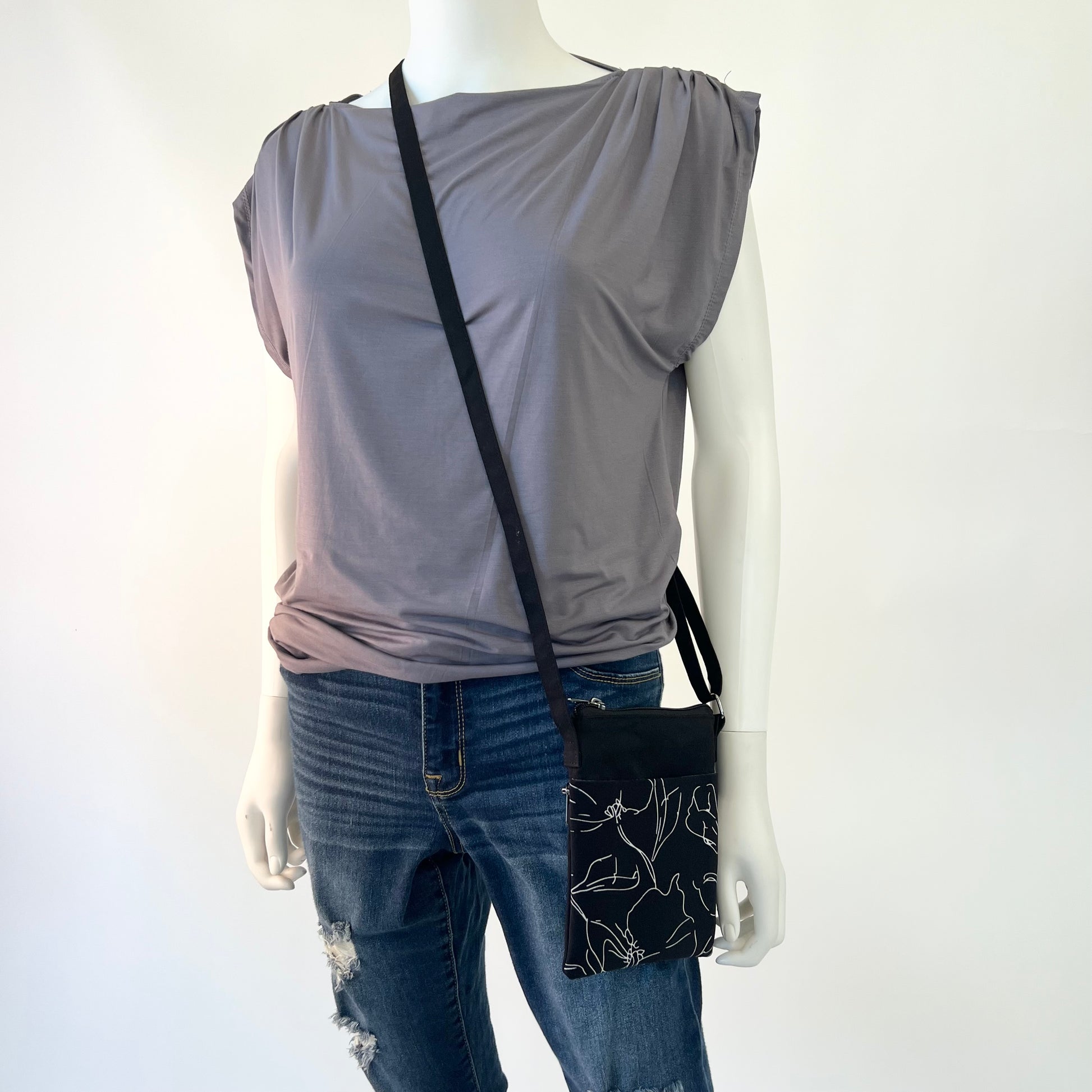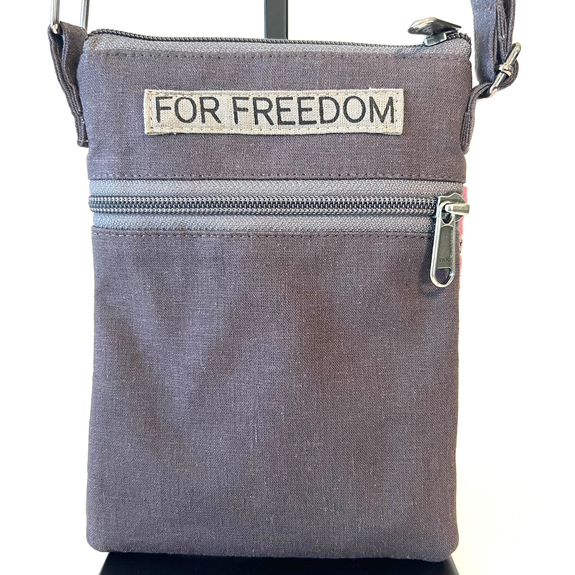 Our Veesal Bag, or our Phone Bag as it is often lovingly called, is a simple compact bag that is perfect for grab and go. Throw your phone, keys and minimalist or Tip wallet inside and you're ready to go! The bag can easily extend cross body making it a perfect bag to go for a walk or concert/event hands free. The front is an open pocket with a zippered pocket on the back. Inside is a small zippered pocket as well. Some of the bags have our For Freedom Label on the back and the others have it on the inside of the bag.